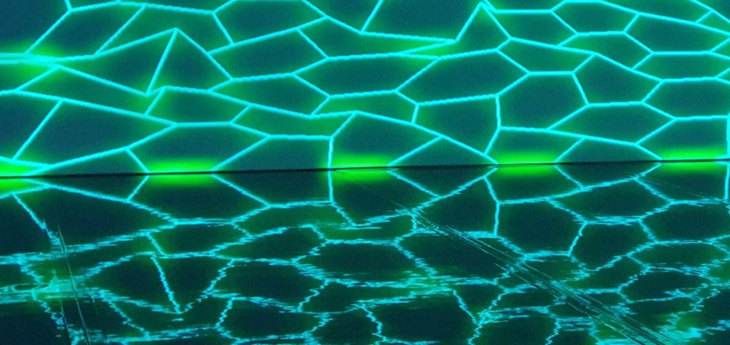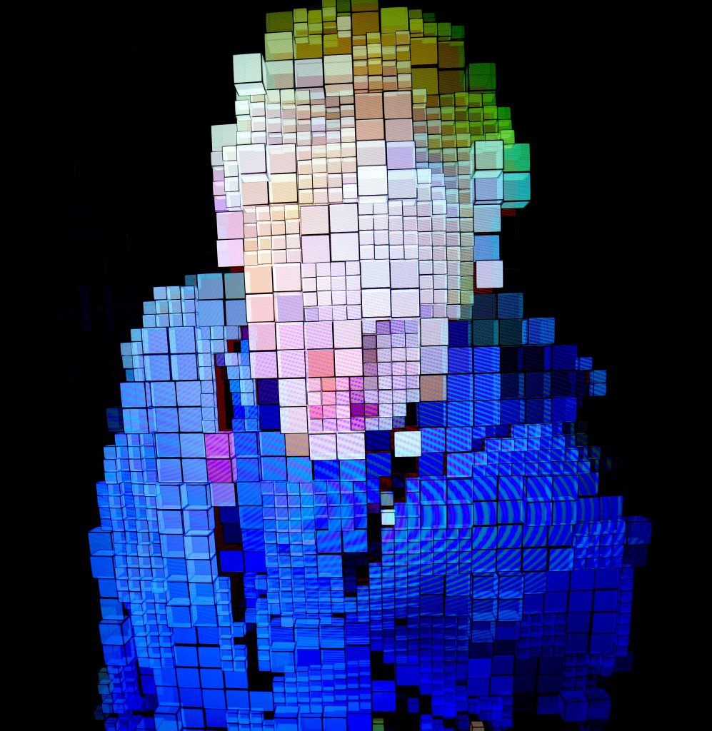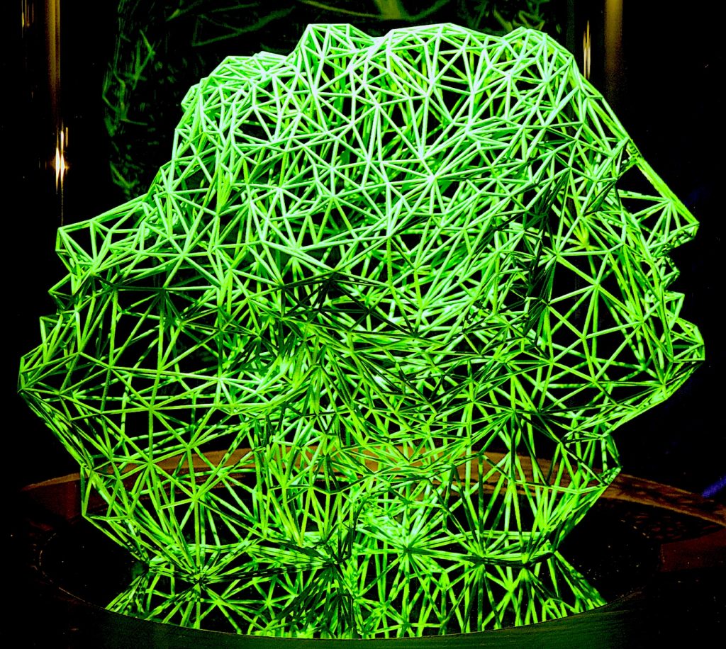 „The Origin of the World“: Ein digitaler Fluß in fließenden Farben zieht hier seine Bahnen. Ein faszinierend roter Januskopf aus dem 3D-Drucker empfängt seine Besucher. Jede Bewegung der Besucher verändert hier die Farben und den digitalen Fluß, der mit instrumentalen Geräuschen untermalt wird.