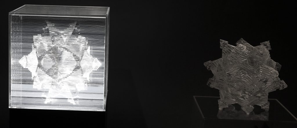 Positiv und Negativ am 3D-Drucker kreierte Schneekristalle.