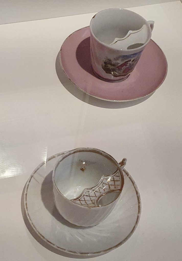 Dank des Inhalts einer Vitrine, die sich in unmittelbarer Nähe der Fotografie befindet, erhalte ich zumindest was das Trinken angeht, eine Antwort: Hier werden drei Barttassen vom Ende des 19. Jahrhunderts ausgestellt, die den Schnurrbart-Trägern das Trinken erleichtern sollten.