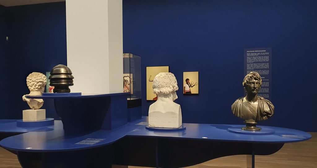 Ein anderer Raum widmet sich „Politischen Verwicklungen“. Hier befindet neben Antiken Abgüssen das bronzierte Terakotta Kunstwerk „Unendliches Profil – Kopf von Mussolini“ von Renato Bertelli (1900 – 1974) aus dem Jahr 1933, das Mussolini in abstrahierter Form mit Glatze darstellt.