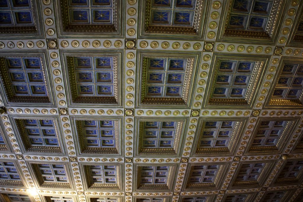 Unsere Ankunft führt uns in den dritten Stock. Der erste Raum empfängt uns mit sehr alten wertvollen Wandteppichen und einer ziemlich eindrucksvollen Decke.